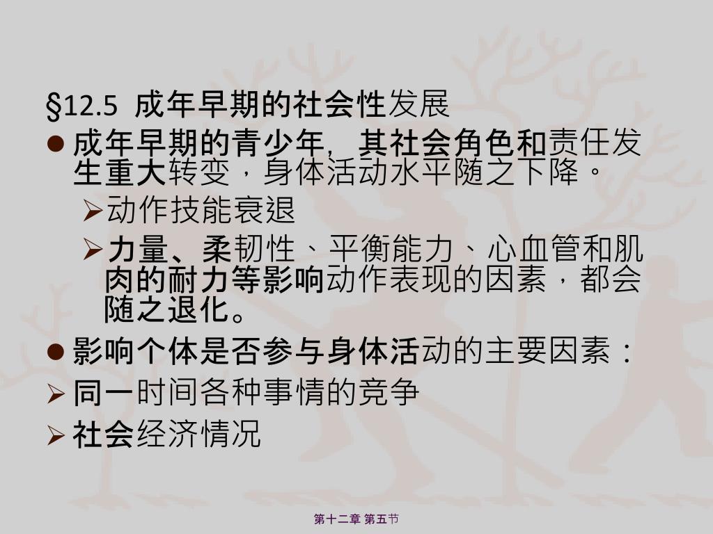 §12.5 成年早期的社会性发展 • 成年早期的青少年,其社会角色和责任发生重大转变,身体活动水平随之下降。 • 动作技能衰退 • 力量、柔韧性、平衡能力、心血管和肌肉的耐力等影响动作表现的因素,都会随之退化。 • 影响个体是否参与身体活动的主要因素: • 同一时间各种事情的竞争 • 社会经济情况 第十二章 第五节