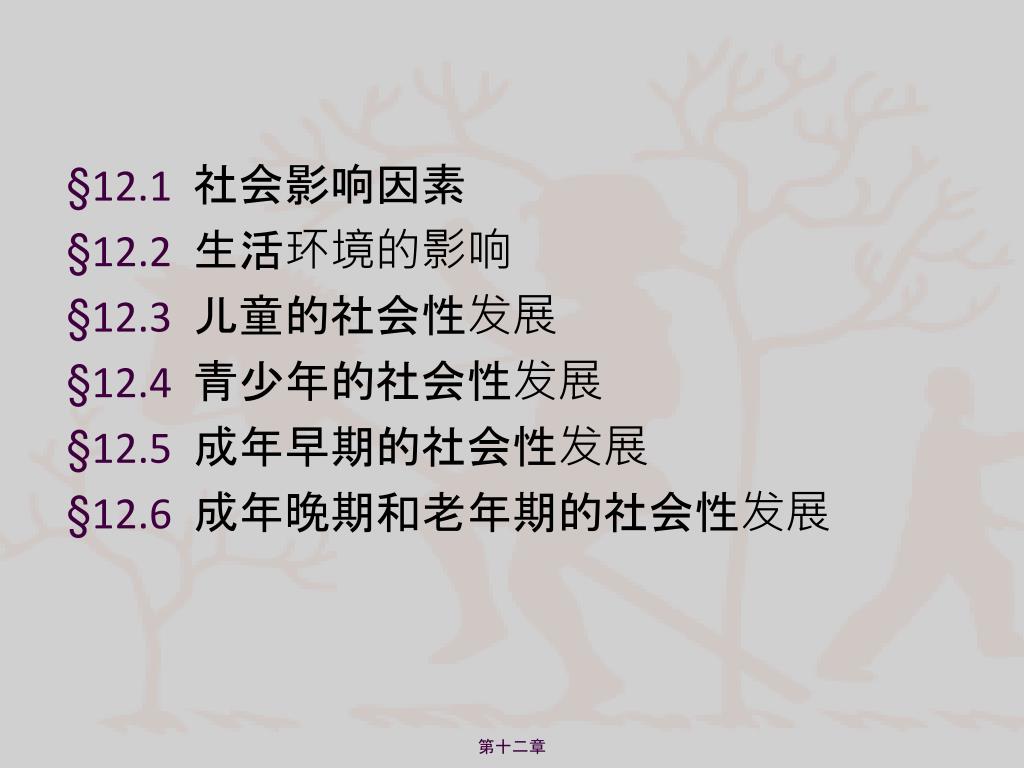 §12.1 社会影响因素 §12.2 生活环境的影响 §12.3 儿童的社会性发展 §12.4 青少年的社会性发展 §12.5 成年早期的社会性发展 §12.6 成年晚期和老年期的社会性发展 第十二章