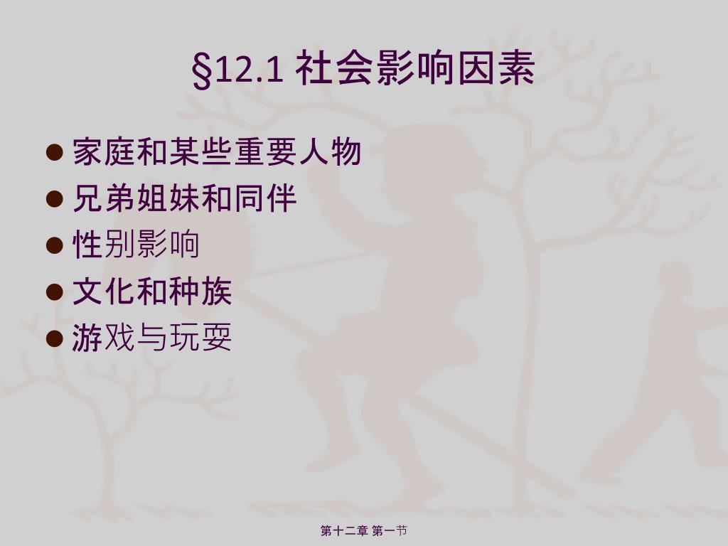 §12.1 社会影响因素 • 家庭和某些重要人物 • 兄弟姐妹和同伴 • 性别影响 • 文化和种族 • 游戏与玩耍 第十二章 第一节