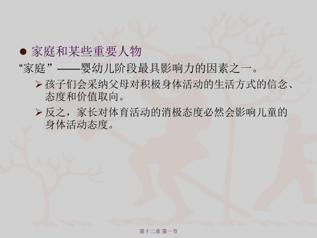 家庭和某些重要人物 “家庭”——婴幼儿阶段最具影响力的因素之一。 • 孩子们会采纳父母对积极身体活动的生活方式的信念、态度和价值取向。 • 反之,家长对体育活动的消极态度必然会影响儿童的身体活动态度。 第十二章 第一节