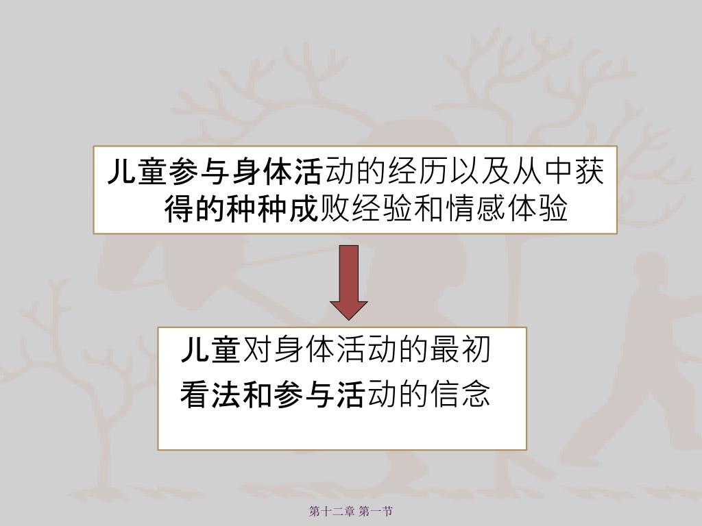 儿童参与身体活动的经历以及从中获 得的种种成败经验和情感体验 儿童对身体活动的最初 看法和参与活动的信念 第十二章 第一节
