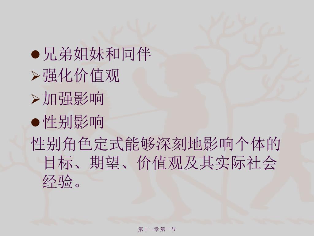 兄弟姐妹和同伴 • 强化价值观 • 加强影响 • 性别影响 性别角色定式能够深刻地影响个体的目标、期望、价值观及其实际社会经验。 第十二章 第一节