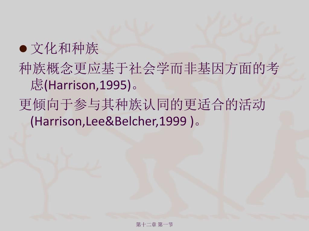 文化和种族 种族概念更应基于社会学而非基因方面的考虑(Harrison,1995)。 更倾向于参与其种族认同的更适合的活动(Harrison,Lee&Belcher,1999 )。 第十二章 第一节
