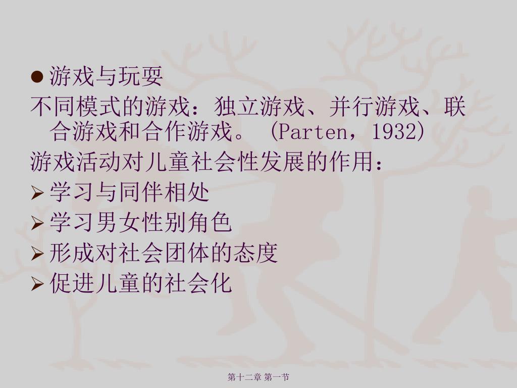 游戏与玩耍 不同模式的游戏:独立游戏、并行游戏、联合游戏和合作游戏。 (Parten,1932) 游戏活动对儿童社会性发展的作用: • 学习与同伴相处 • 学习男女性别角色 • 形成对社会团体的态度 • 促进儿童的社会化 第十二章 第一节