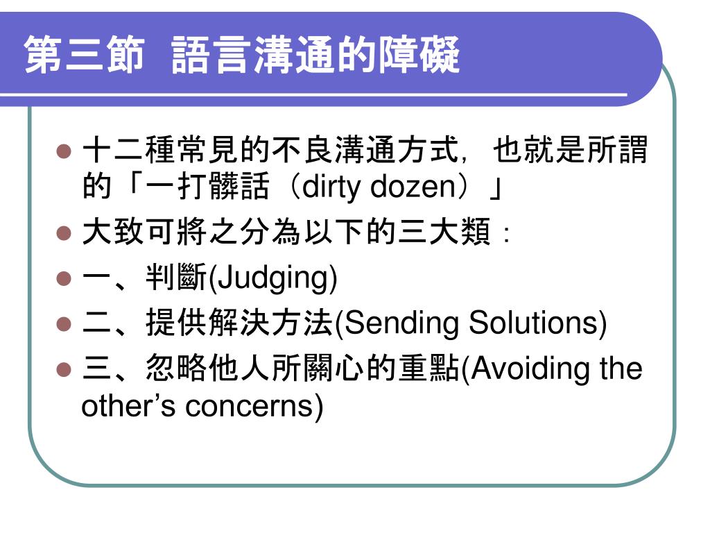 第三節 語言溝通的障礙 • 十二種常見的不良溝通方式,也就是所謂的「一打髒話(dirty dozen)」 • 大致可將之分為以下的三大類: • 一、判斷(Judging) • 二、提供解決方法(Sending Solutions) • 三、忽略他人所關心的重點(Avoiding the other’s concerns)
