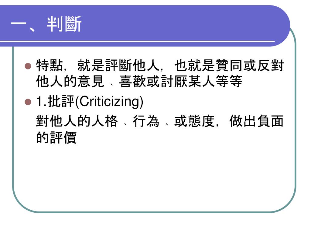 一、判斷 • 特點,就是評斷他人,也就是贊同或反對他人的意見﹑喜歡或討厭某人等等 • 1.批評(Criticizing) 對他人的人格﹑行為﹑或態度,做出負面的評價