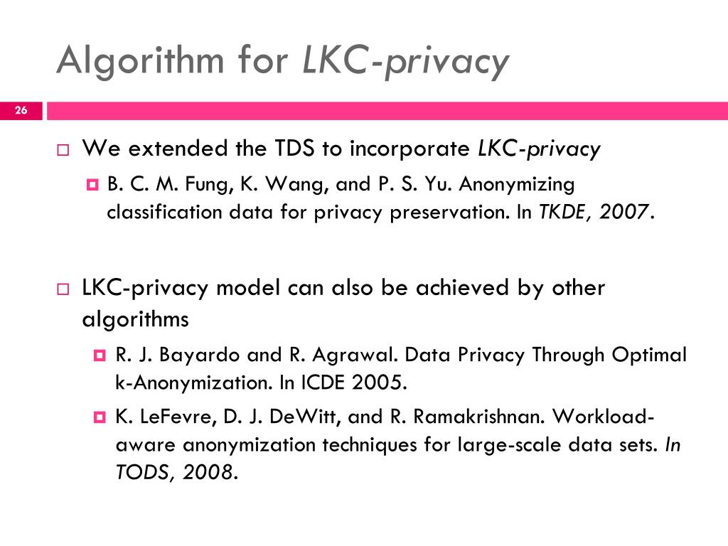 Algorithm for LKC-privacy • We extended the TDS to incorporate LKC-privacy • B. C. M. Fung, K. Wang, and P. S. Yu. Anonymizing classification data for privacy preservation. In TKDE, 2007. • LKC-privacy model can also be achieved by other algorithms • R. J. Bayardo and R. Agrawal. Data Privacy Through Optimal k-Anonymization. In ICDE 2005. • K. LeFevre, D. J. DeWitt, and R. Ramakrishnan. Workload-aware anonymization techniques for large-scale data sets. In TODS, 2008.