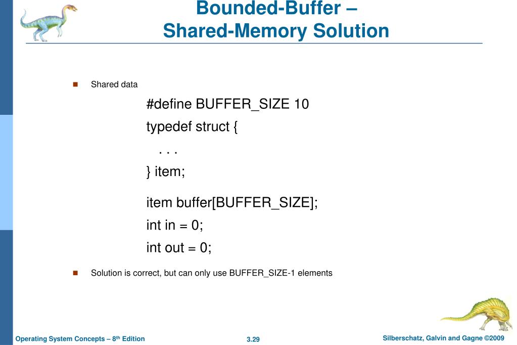 Bounded-Buffer – Shared-Memory Solution • Shared data #define BUFFER_SIZE 10 typedef struct { . . . } item; item buffer[BUFFER_SIZE]; int in = 0; int out = 0; • Solution is correct, but can only use BUFFER_SIZE-1 elements