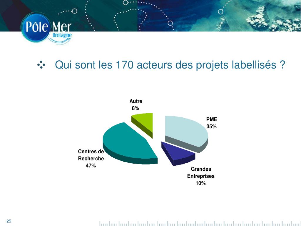 76 projets labellisés dont 58 financés à présent • Etat • FUI (agriculture, santé, industrie, équipement, défense, intérieur)=36% • ANR =19% • OSEO = 6% • ADEME • Collectivités = 32 % • Région • Départements : 22, 29, 35, 56 • Agglomérations • Europe • FEDER= 4 %