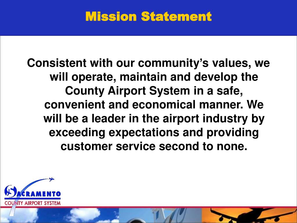 Mission Statement Consistent with our community’s values, we will operate, maintain and develop the County Airport System in a safe, convenient and economical manner. We will be a leader in the airport industry by exceeding expectations and providing customer service second to none.