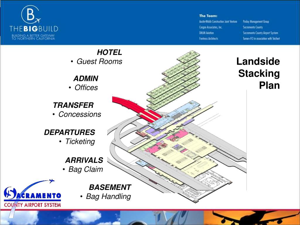 HOTEL • Guest Rooms Landside Stacking Plan • ADMIN • Offices • TRANSFER • Concessions • DEPARTURES • Ticketing • ARRIVALS • Bag Claim • BASEMENT • Bag Handling