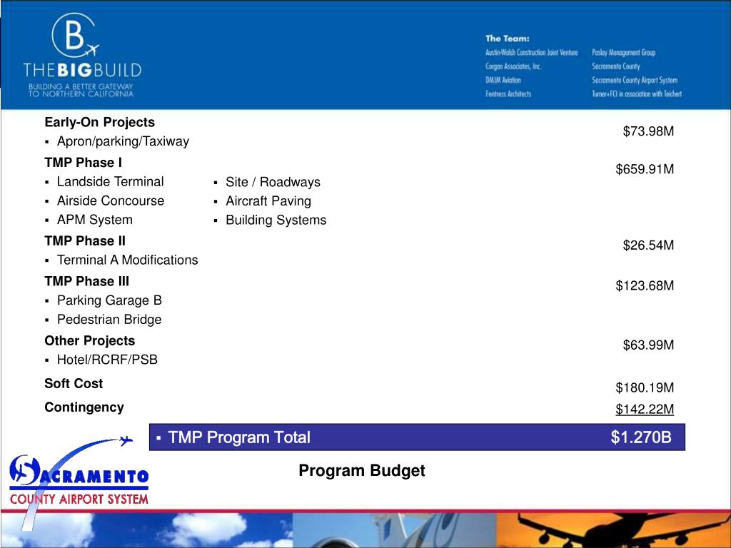 Early-On Projects • Apron/parking/Taxiway TMP Phase I • Landside Terminal • Airside Concourse • APM System TMP Phase II • Terminal A Modifications TMP Phase III • Parking Garage B • Pedestrian Bridge Other Projects • Hotel/RCRF/PSB Soft Cost Contingency $73.98M $659.91M $26.54M $123.68M $63.99M $180.19M $142.22M • Site / Roadways • Aircraft Paving • Building Systems • TMP Program Total $1.270B Program Budget
