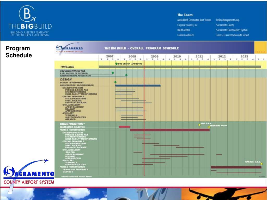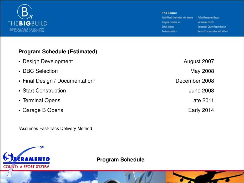 Program Schedule (Estimated) • Design Development • DBC Selection • Final Design / Documentation1 • Start Construction • Terminal Opens • Garage B Opens 1Assumes Fast-track Delivery Method August 2007 May 2008 December 2008 June 2008 Late 2011 Early 2014 Program Schedule