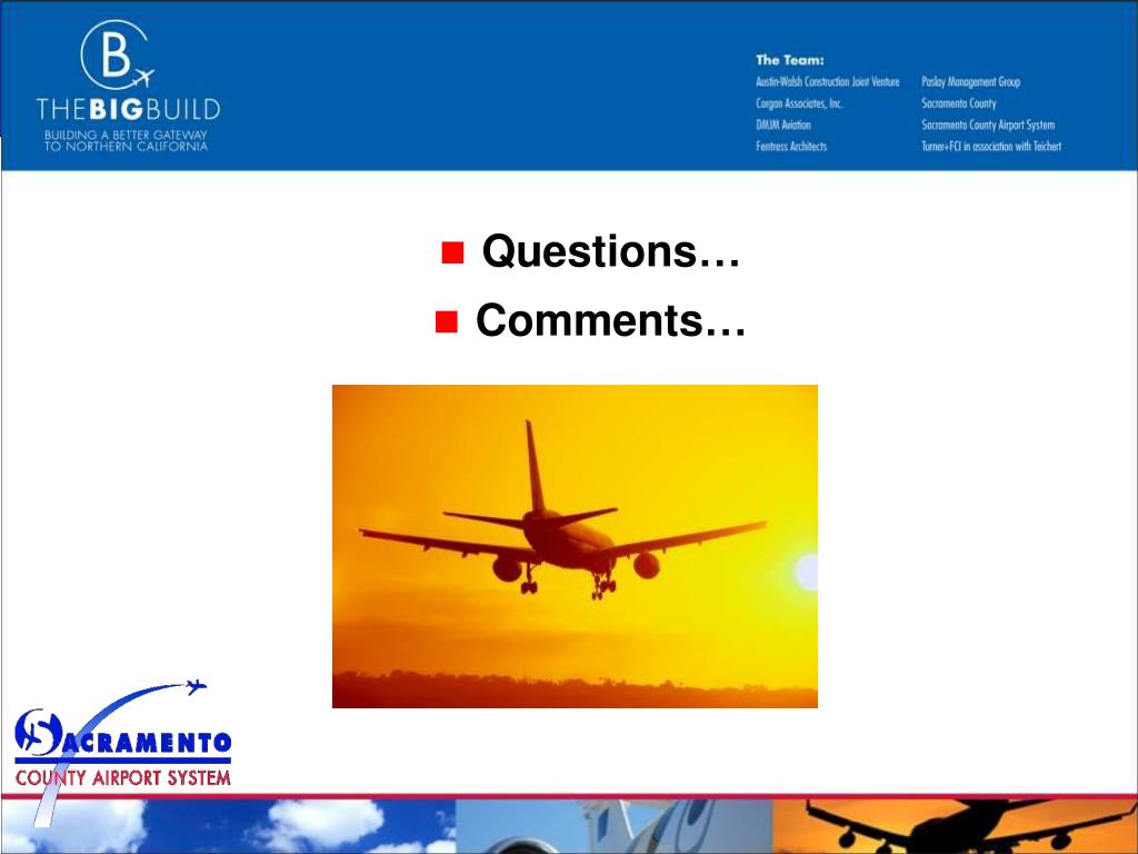 Executive Airport (SAC) • Master Plan update is underway • Public draft expected second quarter of 2009. • Average of 176 flights per day. • The airport consists of520 acres. • Three Runways • RWY 2/20 - 5,530’ x 150’ • 2: ILS, MALSR • 20: REIL, VASI • RWY 12/30 - 3,836’ x 100’ • 12: REIL, VASI • 30: REIL, VASI • RWY 16/34 - 3,485’ x 150’ • 16/34: visual