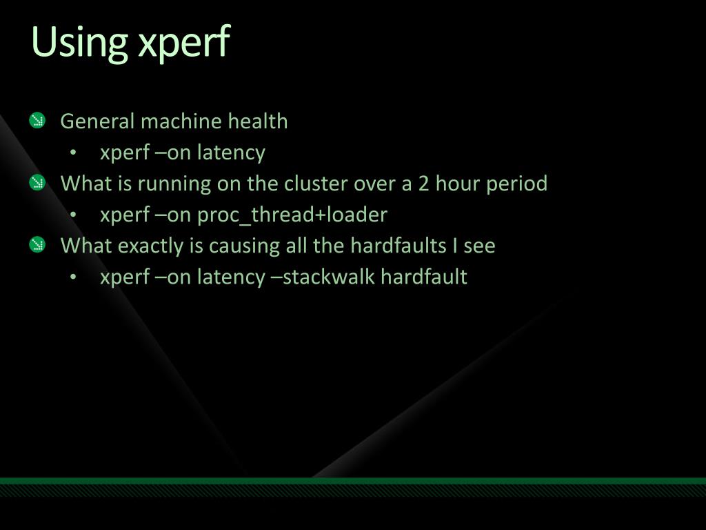 Using xperf • General machine health • xperf –on latency • What is running on the cluster over a 2 hour period • xperf –on proc_thread+loader • What exactly is causing all the hardfaults I see • xperf –on latency –stackwalkhardfault