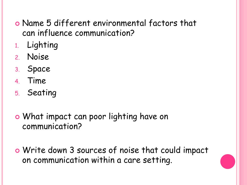Name 5 different environmental factors that can influence communication? • Lighting • Noise • Space • Time • Seating • What impact can poor lighting have on communication? • Write down 3 sources of noise that could impact on communication within a care setting.
