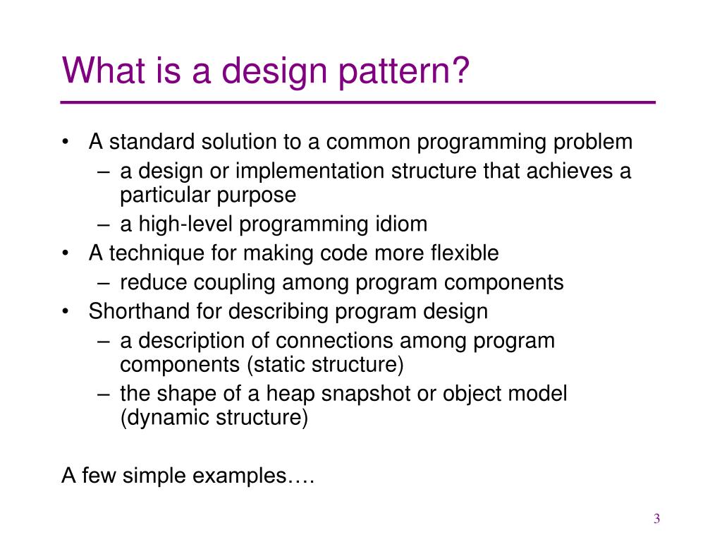 What is a design pattern? • A standard solution to a common programming problem • a design or implementation structure that achieves a particular purpose • a high-level programming idiom • A technique for making code more flexible • reduce coupling among program components • Shorthand for describing program design • a description of connections among program components (static structure) • the shape of a heap snapshot or object model (dynamic structure) A few simple examples….