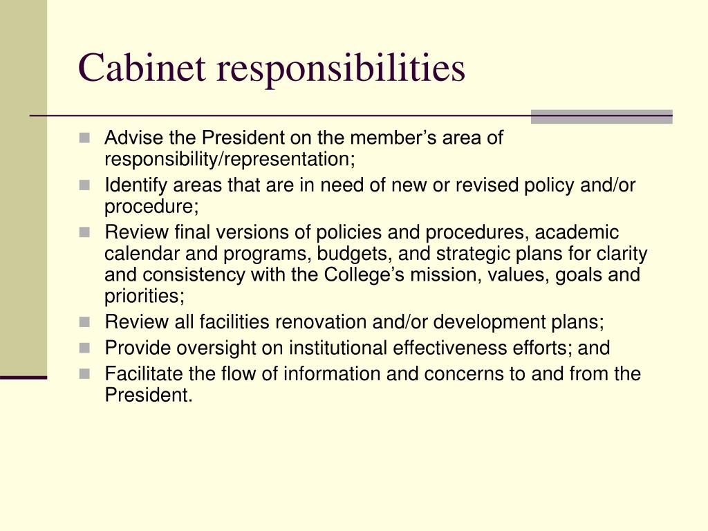 Cabinet responsibilities • Advise the President on the member’s area of responsibility/representation; • Identify areas that are in need of new or revised policy and/or procedure; • Review final versions of policies and procedures, academic calendar and programs, budgets, and strategic plans for clarity and consistency with the College’s mission, values, goals and priorities; • Review all facilities renovation and/or development plans; • Provide oversight on institutional effectiveness efforts; and • Facilitate the flow of information and concerns to and from the President.