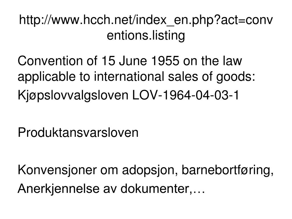 http://www.hcch.net/index_en.php?act=conventions.listing Convention of 15 June 1955 on the law applicable to international sales of goods: Kjøpslovvalgsloven LOV-1964-04-03-1 Produktansvarsloven Konvensjoner om adopsjon, barnebortføring, Anerkjennelse av dokumenter,…