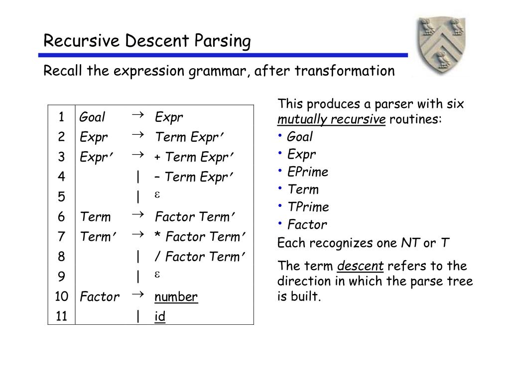 Recursive Descent Parsing Recall the expression grammar, after transformation • This produces a parser with six mutually recursive routines: • Goal • Expr • EPrime • Term • TPrime • Factor • Each recognizes one NT or T • The term descent refers to the direction in which the parse tree is built.