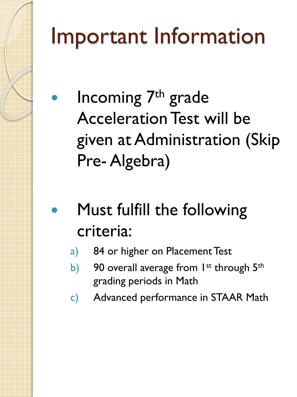 Important Information • Incoming 7th grade Acceleration Test will be given at Administration (Skip Pre- Algebra) • Must fulfill the following criteria: • 84 or higher on Placement Test • 90 overall average from 1st through 5th grading periods in Math • Advanced performance in STAAR Math