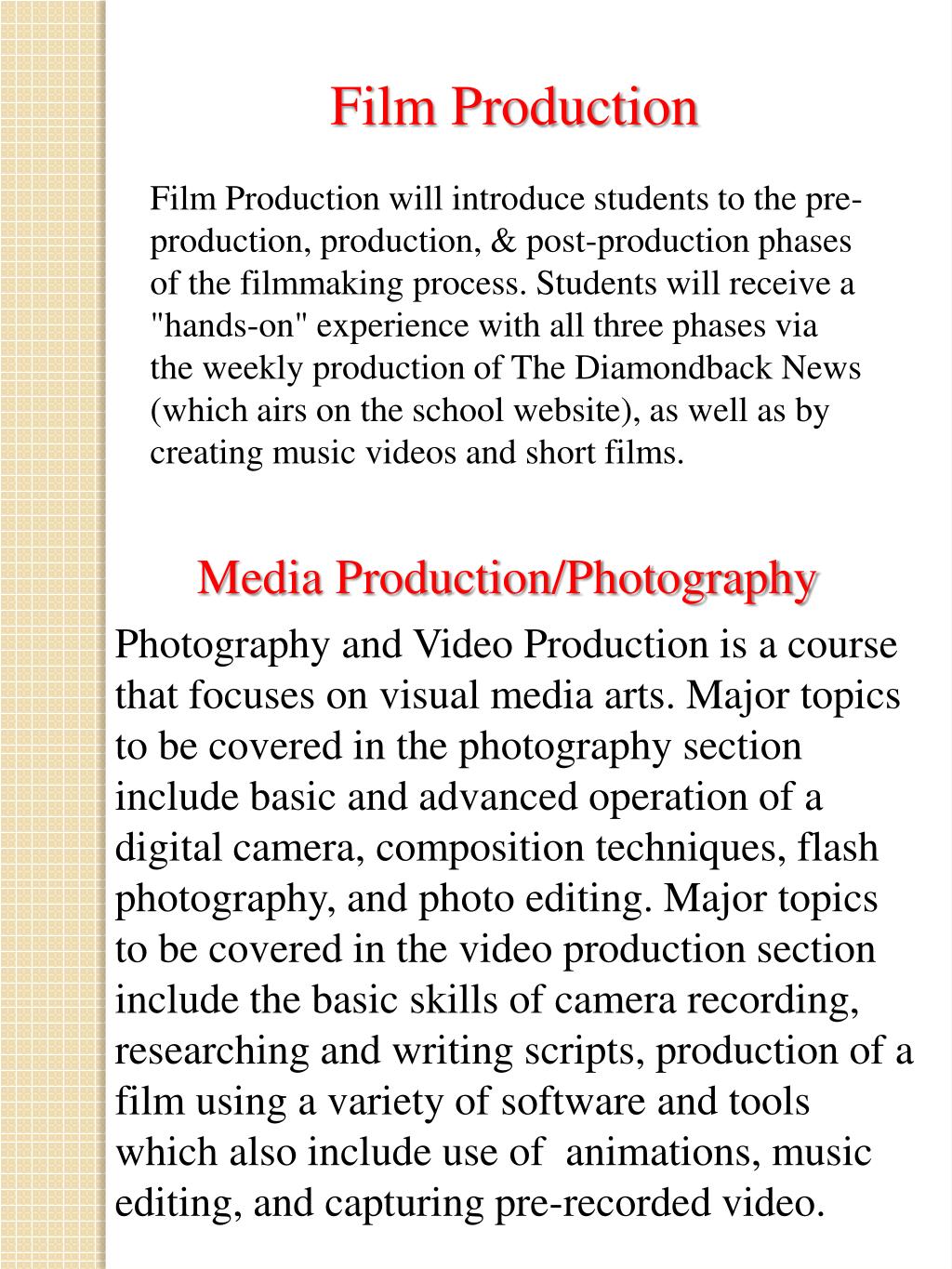 Film Production Film Production will introduce students to the pre-production, production, & post-production phases of the filmmaking process. Students will receive a "hands-on" experience with all three phases via the weekly production of The Diamondback News (which airs on the school website), as well as by creating music videos and short films. Media Production/Photography • Photography and Video Production is a course that focuses on visual media arts. Major topics to be covered in the photography section include basic and advanced operation of a digital camera, composition techniques, flash photography, and photo editing. Major topics to be covered in the video production section include the basic skills of camera recording, researching and writing scripts, production of a film using a variety of software and tools which also include use of animations, music editing, and capturing pre-recorded video.