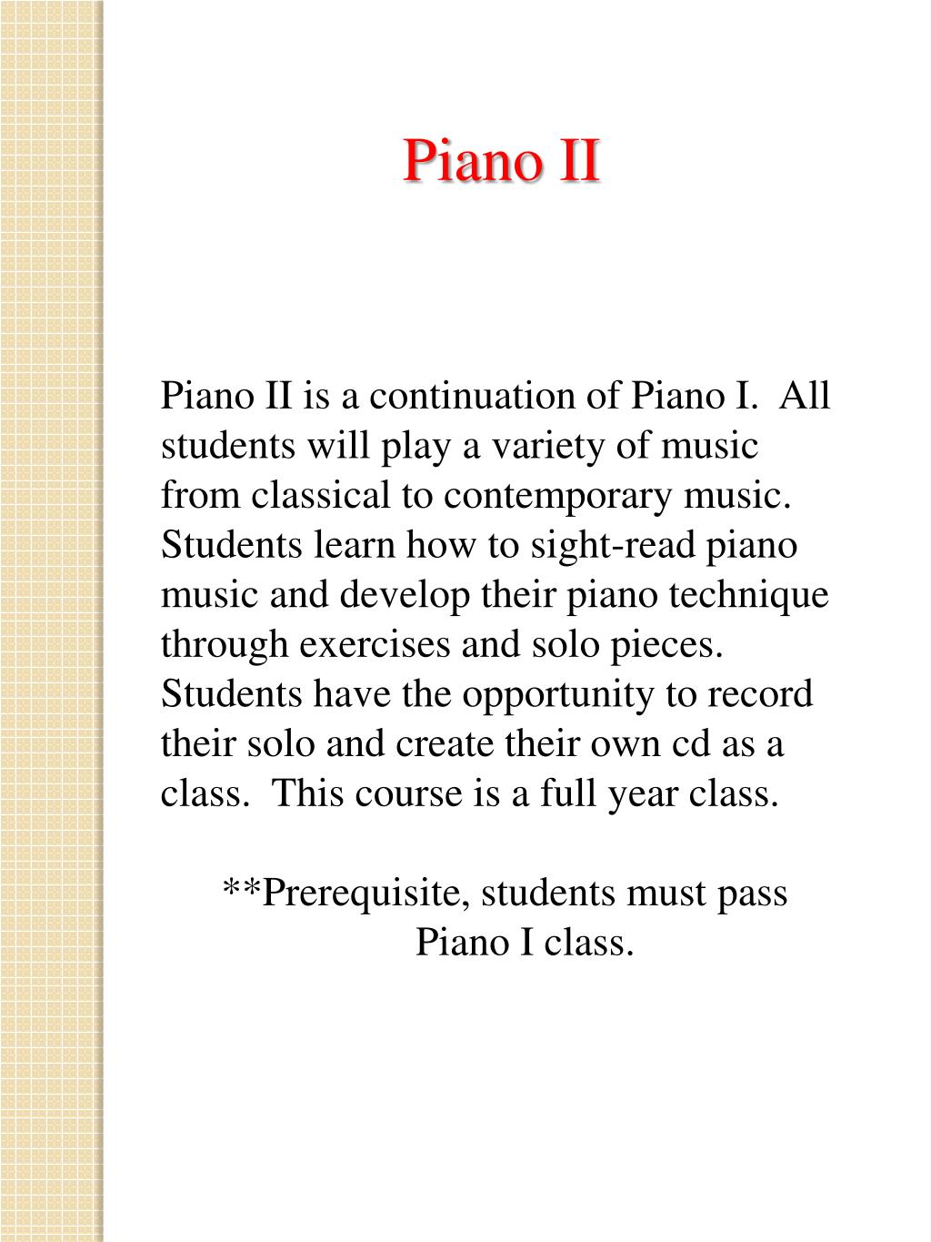 Piano II Piano II is a continuation of Piano I. All students will play a variety of music from classical to contemporary music. Students learn how to sight-read piano music and develop their piano technique through exercises and solo pieces. Students have the opportunity to record their solo and create their own cd as a class. This course is a full year class. **Prerequisite, students must pass Piano I class.