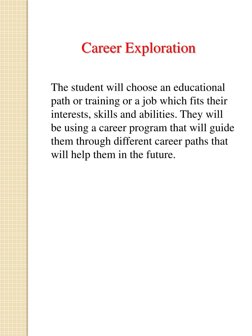 Career Exploration The student will choose an educational path or training or a job which fits their interests, skills and abilities. They will be using a career program that will guide them through different career paths that will help them in the future.