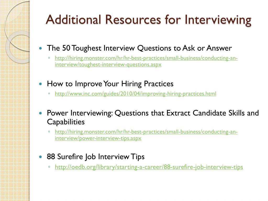 Additional Resources for Interviewing • The 50 Toughest Interview Questions to Ask or Answer • http://hiring.monster.com/hr/hr-best-practices/small-business/conducting-an-interview/toughest-interview-questions.aspx • How to Improve Your Hiring Practices • http://www.inc.com/guides/2010/04/improving-hiring-practices.html • Power Interviewing: Questions that Extract Candidate Skills and Capabilities • http://hiring.monster.com/hr/hr-best-practices/small-business/conducting-an-interview/power-interview-tips.aspx • 88 Surefire Job Interview Tips • http://oedb.org/library/starting-a-career/88-surefire-job-interview-tips