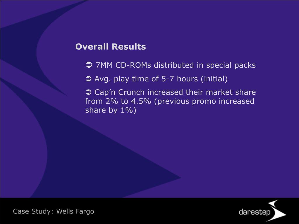 Overall Results • 7MM CD-ROMs distributed in special packs • Avg. play time of 5-7 hours (initial) • Cap’n Crunch increased their market share from 2% to 4.5% (previous promo increased share by 1%) Case Study: Wells Fargo