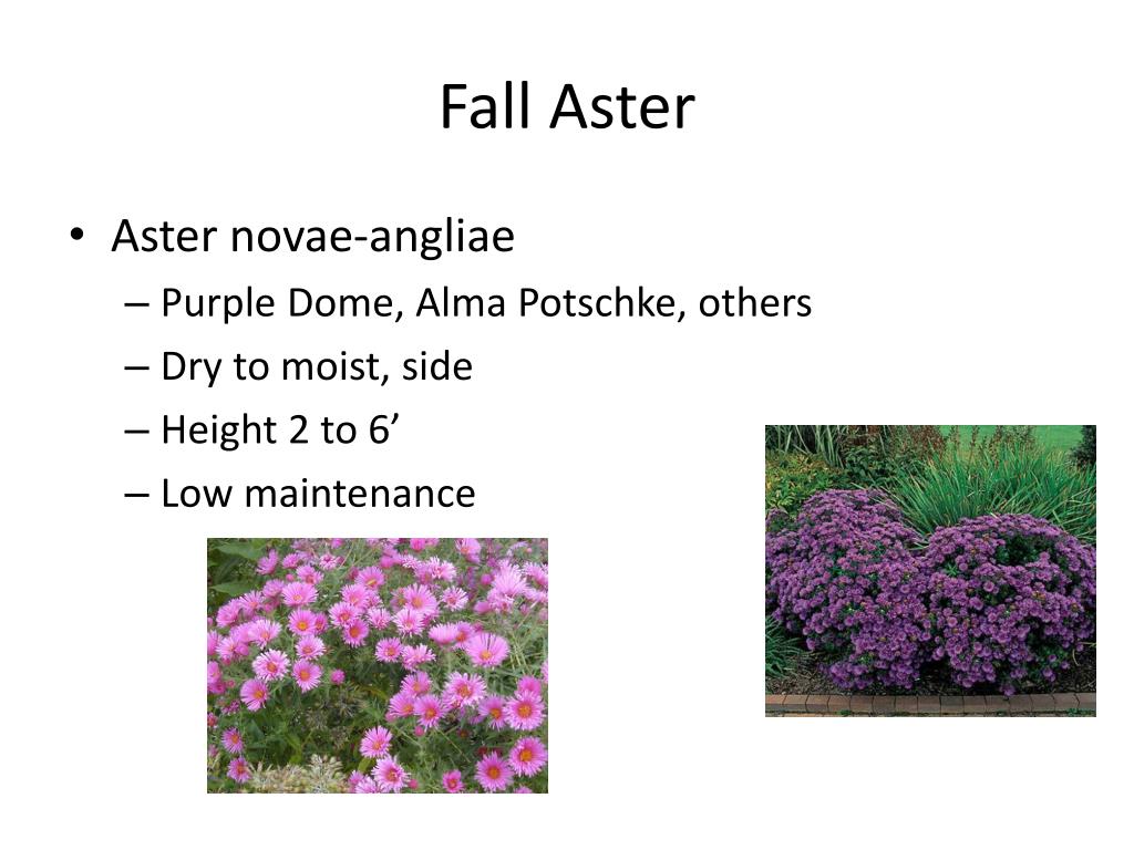 Fall Aster • Aster novae-angliae • Purple Dome, Alma Potschke, others • Dry to moist, side • Height 2 to 6’ • Low maintenance