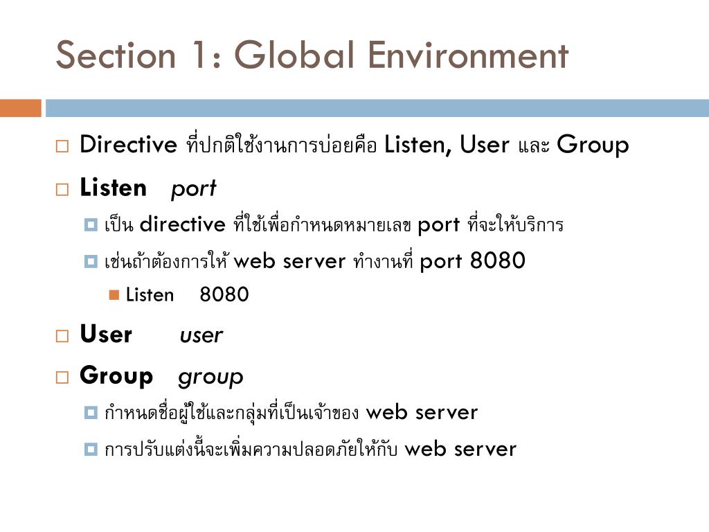 Section 1: Global Environment • Directive ที่ปกติใช้งานการบ่อยคือ Listen, User และ Group • Listenport • เป็น directive ที่ใช้เพื่อกำหนดหมายเลข port ที่จะให้บริการ • เช่นถ้าต้องการให้ web server ทำงานที่ port 8080 • Listen 8080 • Useruser • Groupgroup • กำหนดชื่อผู้ใช้และกลุ่มที่เป็นเจ้าของ web server • การปรับแต่งนี้จะเพิ่มความปลอดภัยให้กับ web server