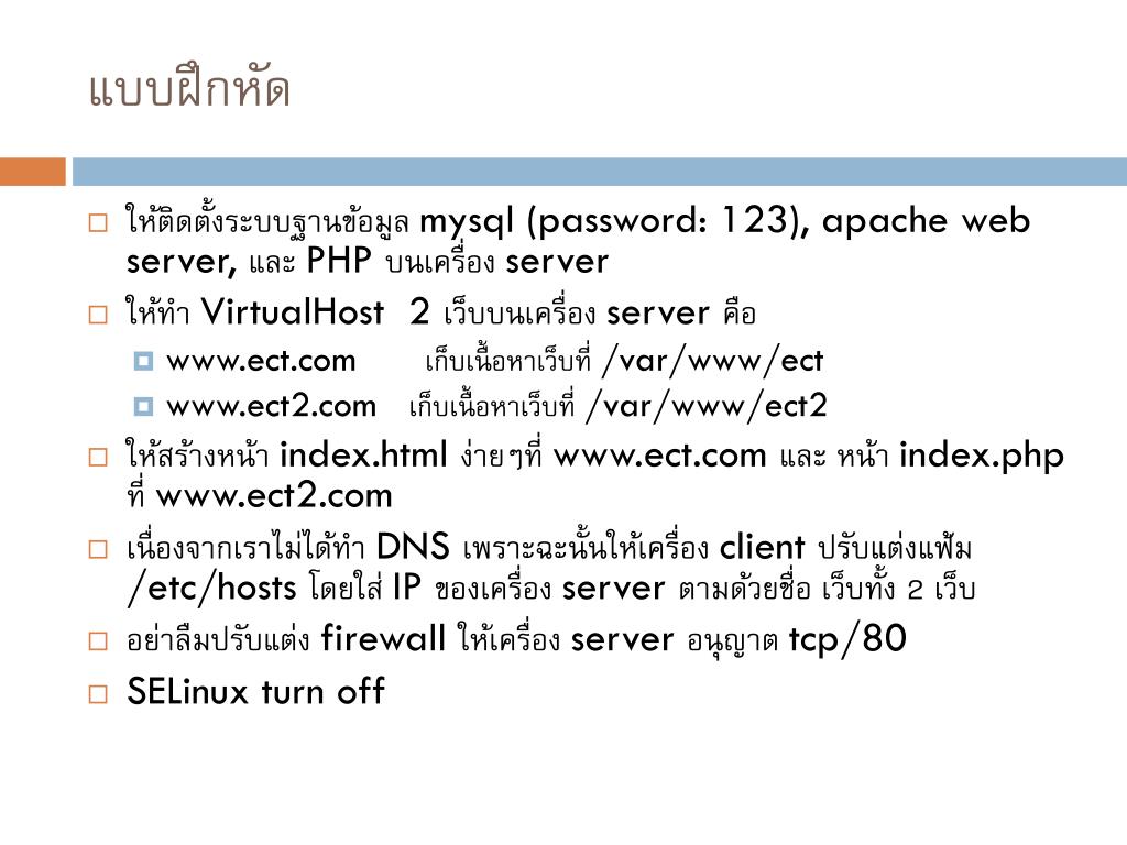 แบบฝึกหัด • ให้ติดตั้งระบบฐานข้อมูล mysql (password: 123), apache web server, และ PHP บนเครื่อง server • ให้ทำ VirtualHost 2 เว็บบนเครื่อง server คือ • www.ect.com เก็บเนื้อหาเว็บที่ /var/www/ect • www.ect2.com เก็บเนื้อหาเว็บที่ /var/www/ect2 • ให้สร้างหน้า index.html ง่ายๆที่ www.ect.com และ หน้า index.php ที่ www.ect2.com • เนื่องจากเราไม่ได้ทำ DNS เพราะฉะนั้นให้เครื่อง client ปรับแต่งแฟ้ม /etc/hosts โดยใส่ IP ของเครื่อง server ตามด้วยชื่อ เว็บทั้ง 2 เว็บ • อย่าลืมปรับแต่ง firewall ให้เครื่อง server อนุญาต tcp/80 • SELinux turn off