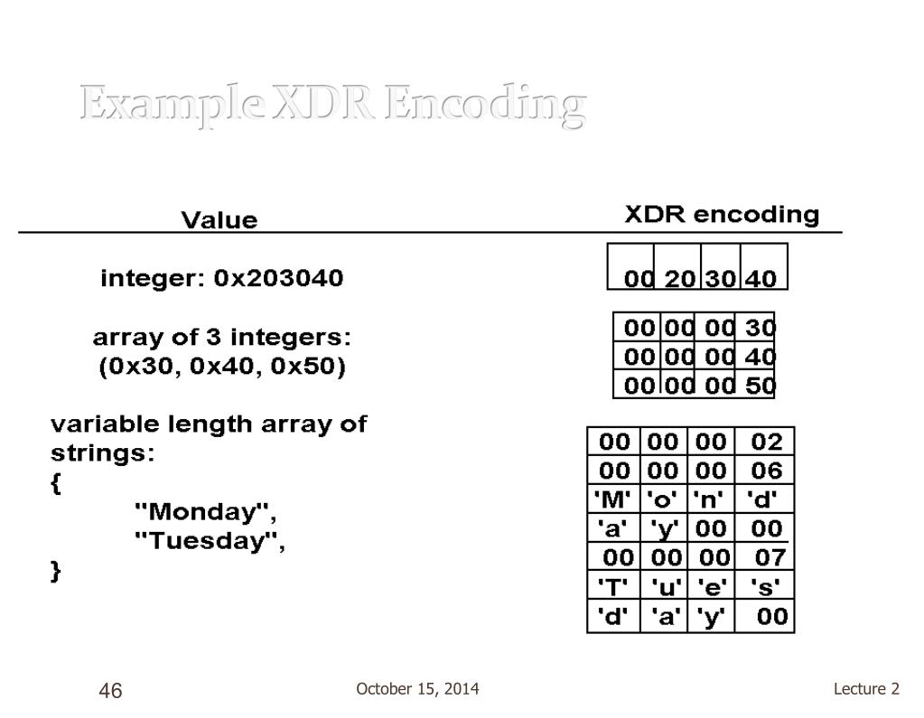 Some Basic XDR data elements • Integers • 4bytes, (0,1,2,3, big endian), 2’s compliment • Variable-length opaque data • Length n*(4bytes), data ended by NULL padded • Strings • Length n*(4bytes), data ended by NULL padded • Arrays • Size n*(4bytes), same type of data • Structures • Natural order Lecture 2