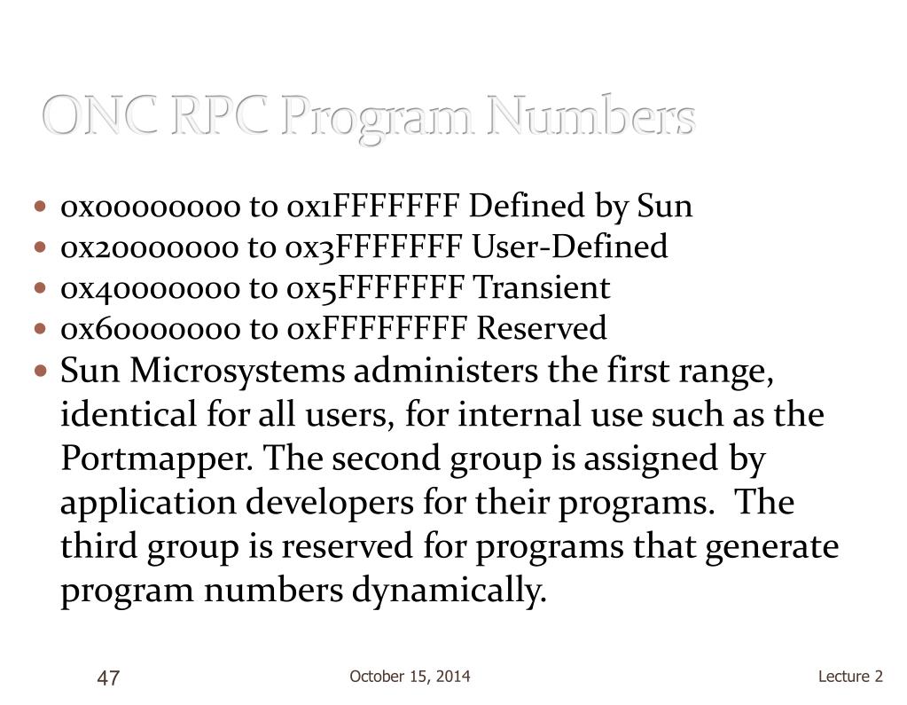 ONC RPC Program Numbers • 0x00000000 to 0x1FFFFFFF Defined by Sun • 0x20000000 to 0x3FFFFFFF User-Defined • 0x40000000 to 0x5FFFFFFF Transient • 0x60000000 to 0xFFFFFFFF Reserved • Sun Microsystems administers the first range, identical for all users, for internal use such as the Portmapper. The second group is assigned by application developers for their programs. The third group is reserved for programs that generate program numbers dynamically. Lecture 2