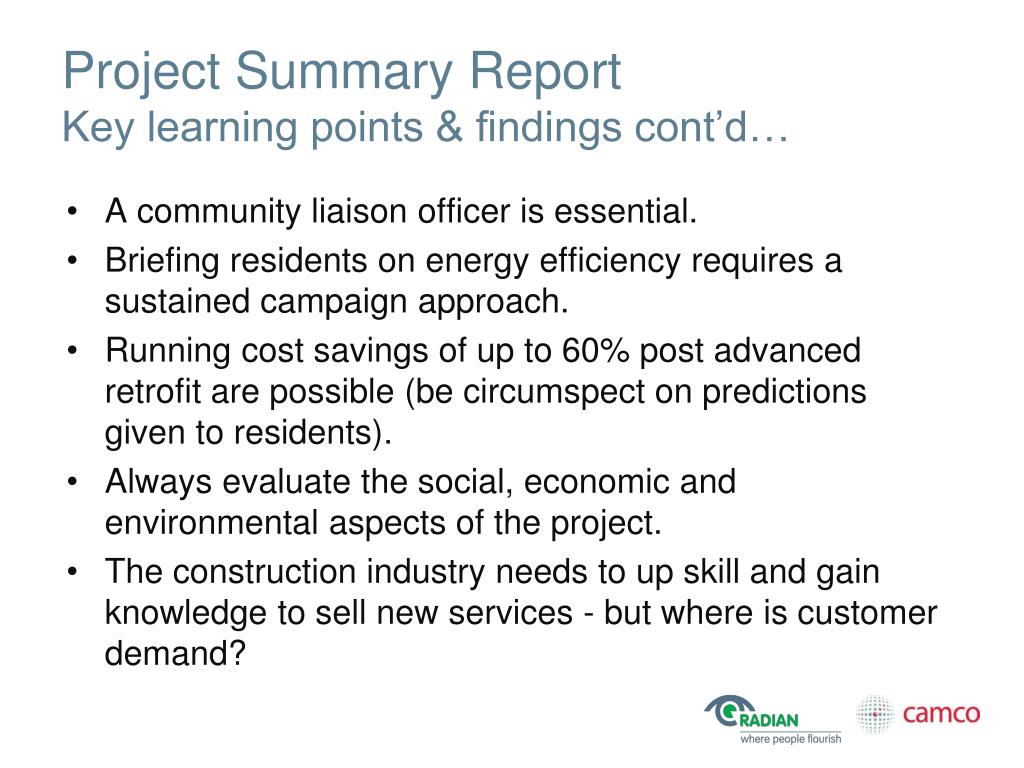 Project Summary Report Key learning points & findings cont’d… • A community liaison officer is essential. • Briefing residents on energy efficiency requires a sustained campaign approach. • Running cost savings of up to 60% post advanced retrofit are possible (be circumspect on predictions given to residents). • Always evaluate the social, economic and environmental aspects of the project. • The construction industry needs to up skill and gain knowledge to sell new services - but where is customer demand?