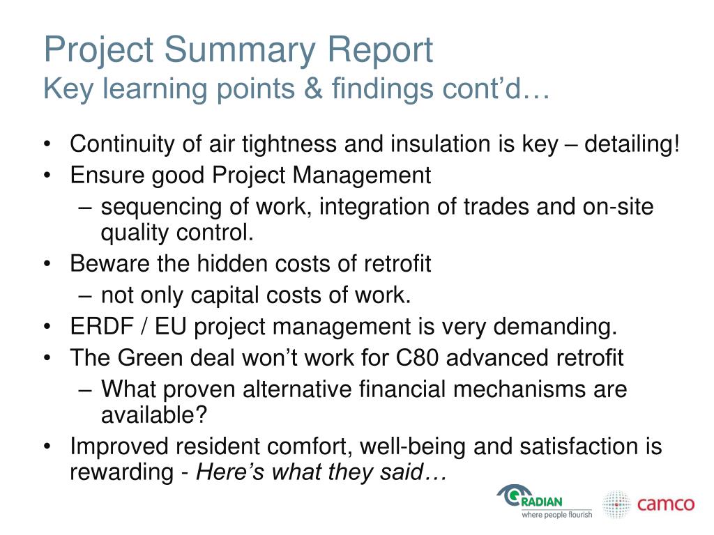 Project Summary Report Key learning points & findings cont’d… • Continuity of air tightness and insulation is key – detailing! • Ensure good Project Management • sequencing of work, integration of trades and on-site quality control. • Beware the hidden costs of retrofit • not only capital costs of work. • ERDF / EU project management is very demanding. • The Green deal won’t work for C80 advanced retrofit • What proven alternative financial mechanisms are available? • Improved resident comfort, well-being and satisfaction is rewarding - Here’s what they said…