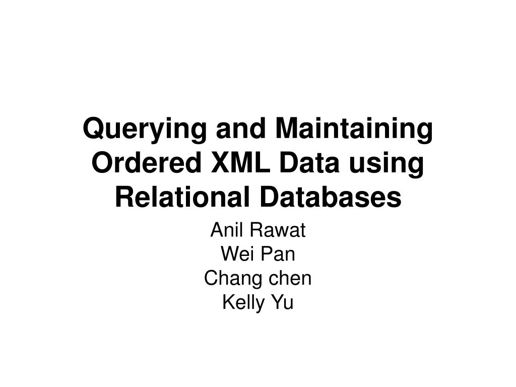 Querying and Maintaining Ordered XML Data using Relational Databases Anil Rawat Wei Pan Chang chen Kelly Yu