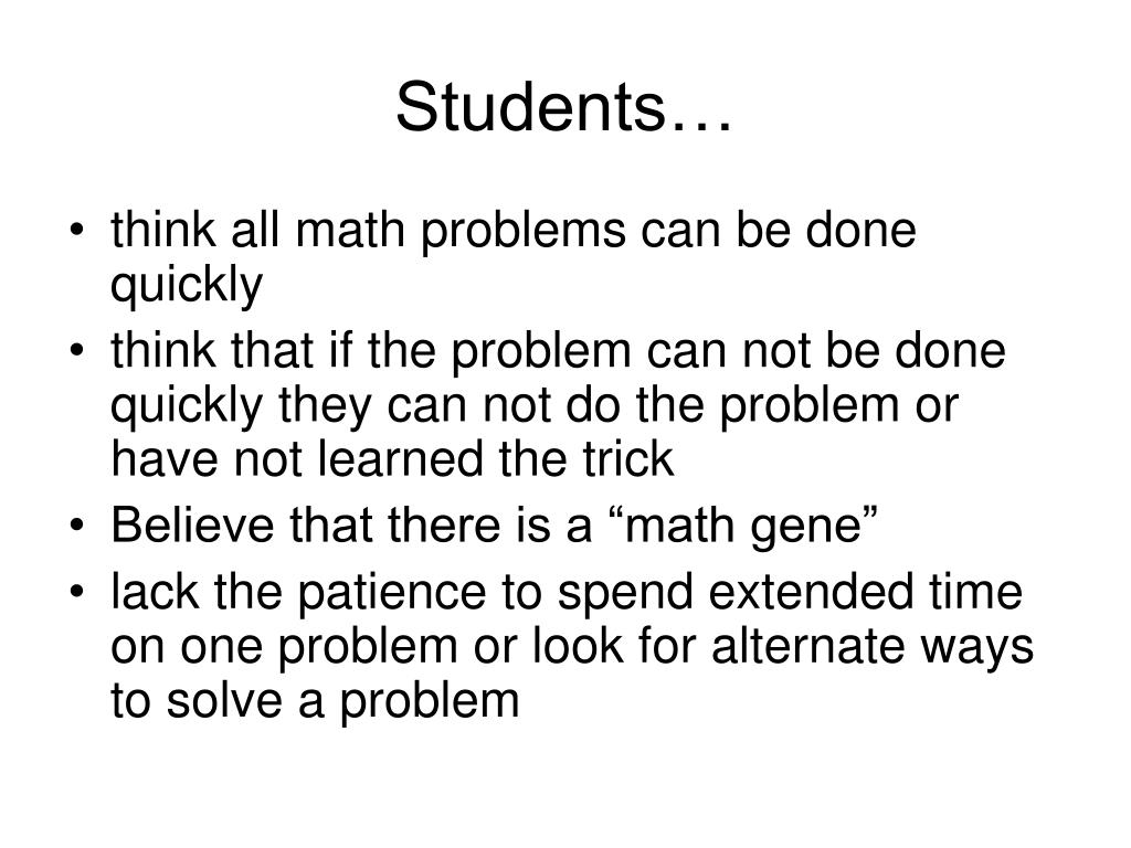 Students… • think all math problems can be done quickly • think that if the problem can not be done quickly they can not do the problem or have not learned the trick • Believe that there is a “math gene” • lack the patience to spend extended time on one problem or look for alternate ways to solve a problem