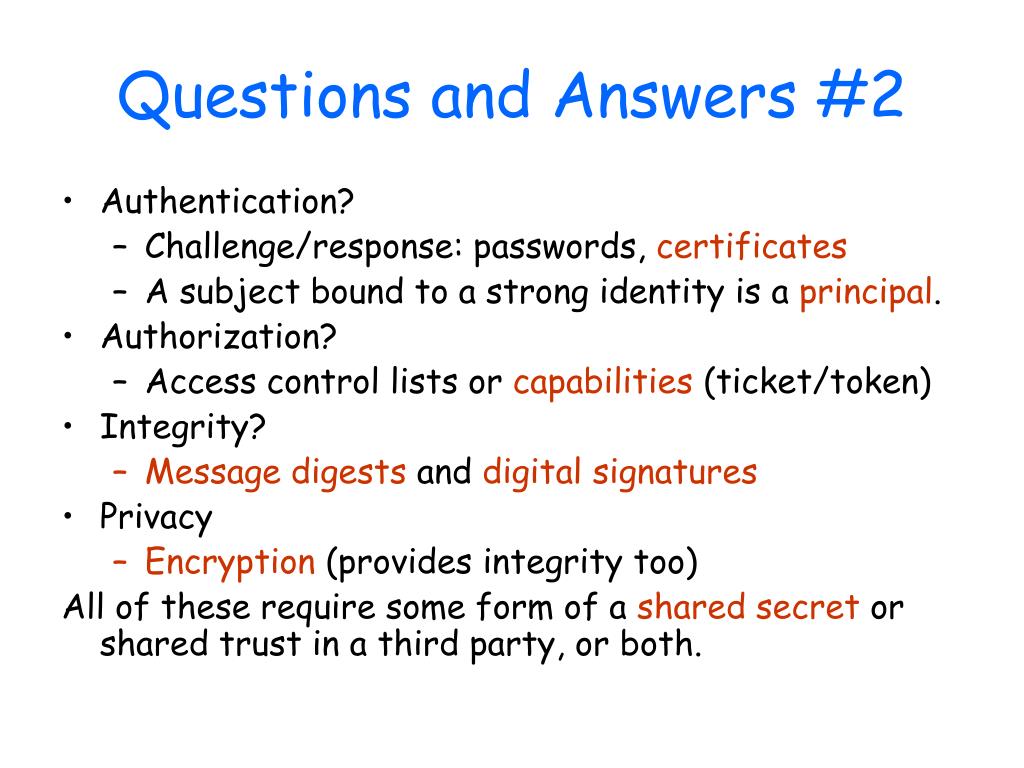 Questions and Answers #2 • Authentication? • Challenge/response: passwords, certificates • A subject bound to a strong identity is a principal. • Authorization? • Access control lists or capabilities (ticket/token) • Integrity? • Message digests and digital signatures • Privacy • Encryption (provides integrity too) All of these require some form of a shared secret or shared trust in a third party, or both.