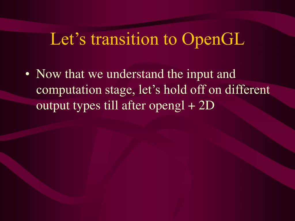 Let’s transition to OpenGL • Now that we understand the input and computation stage, let’s hold off on different output types till after opengl + 2D