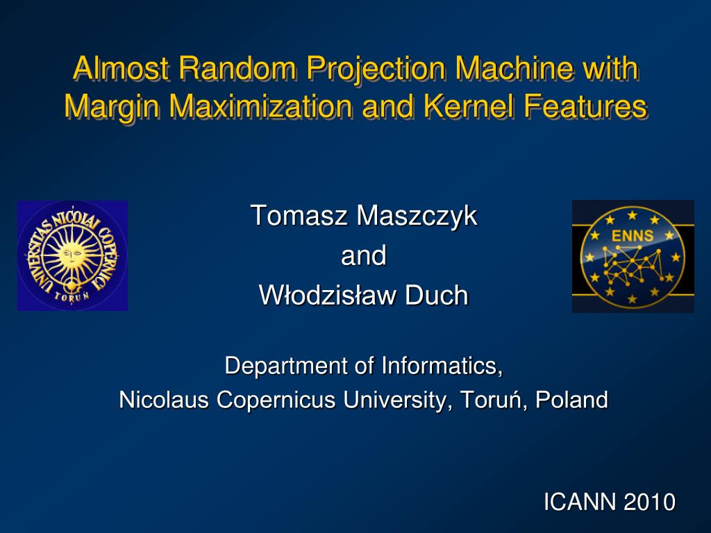 Almost Random Projection Machine with Margin Maximization and Kernel Features Tomasz Maszczyk and Włodzisław Duch Department of Informatics, Nicolaus Copernicus University, Toruń, Poland ICANN 2010