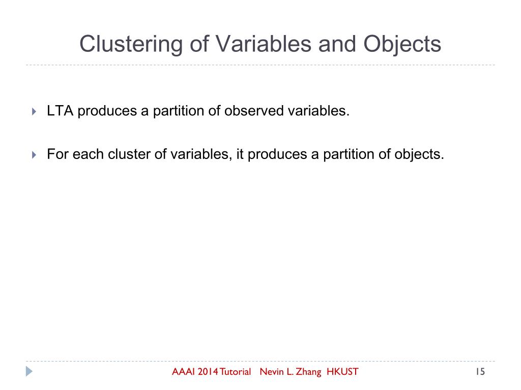 Clustering of Variables and Objects • LTA produces a partition of observed variables. • For each cluster of variables, it produces a partition of objects.