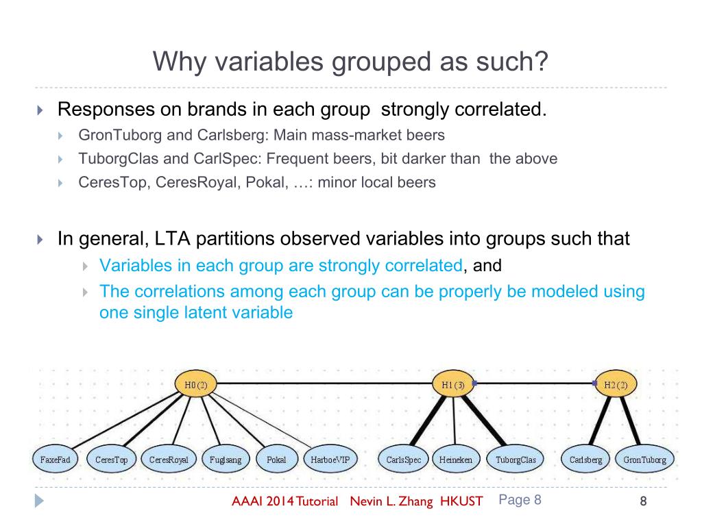 Why variables grouped as such? • Responses on brands in each group strongly correlated. • GronTuborg and Carlsberg: Main mass-market beers • TuborgClas and CarlSpec: Frequent beers, bit darker than the above • CeresTop, CeresRoyal, Pokal, …: minor local beers • In general, LTA partitions observed variables into groups such that • Variables in each group are strongly correlated, and • The correlations among each group can be properly be modeled using one single latent variable