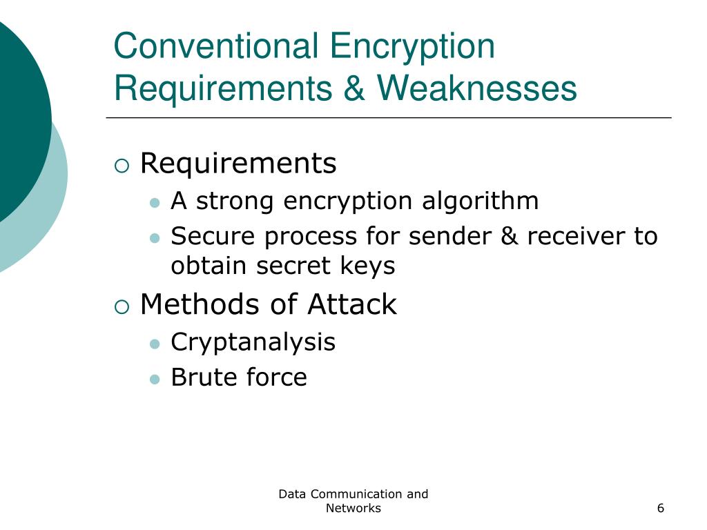 Conventional Encryption Requirements & Weaknesses • Requirements • A strong encryption algorithm • Secure process for sender & receiver to obtain secret keys • Methods of Attack • Cryptanalysis • Brute force Data Communication and Networks