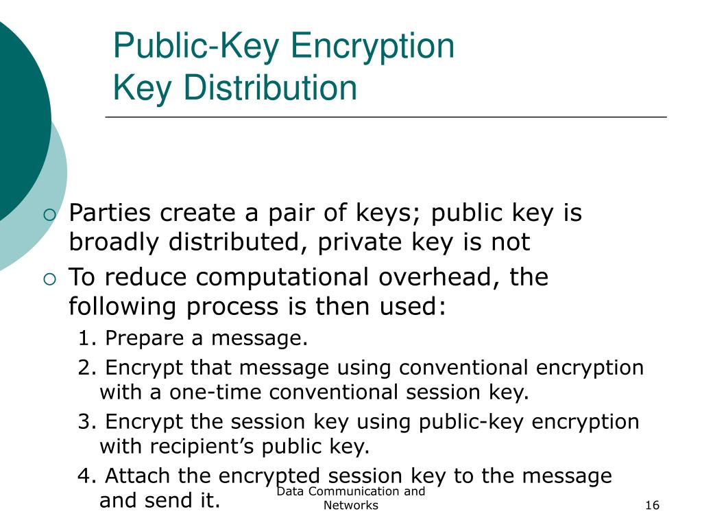Public-Key EncryptionKey Distribution • Parties create a pair of keys; public key is broadly distributed, private key is not • To reduce computational overhead, the following process is then used: 1. Prepare a message. 2. Encrypt that message using conventional encryption with a one-time conventional session key. 3. Encrypt the session key using public-key encryption with recipient’s public key. 4. Attach the encrypted session key to the message and send it. Data Communication and Networks