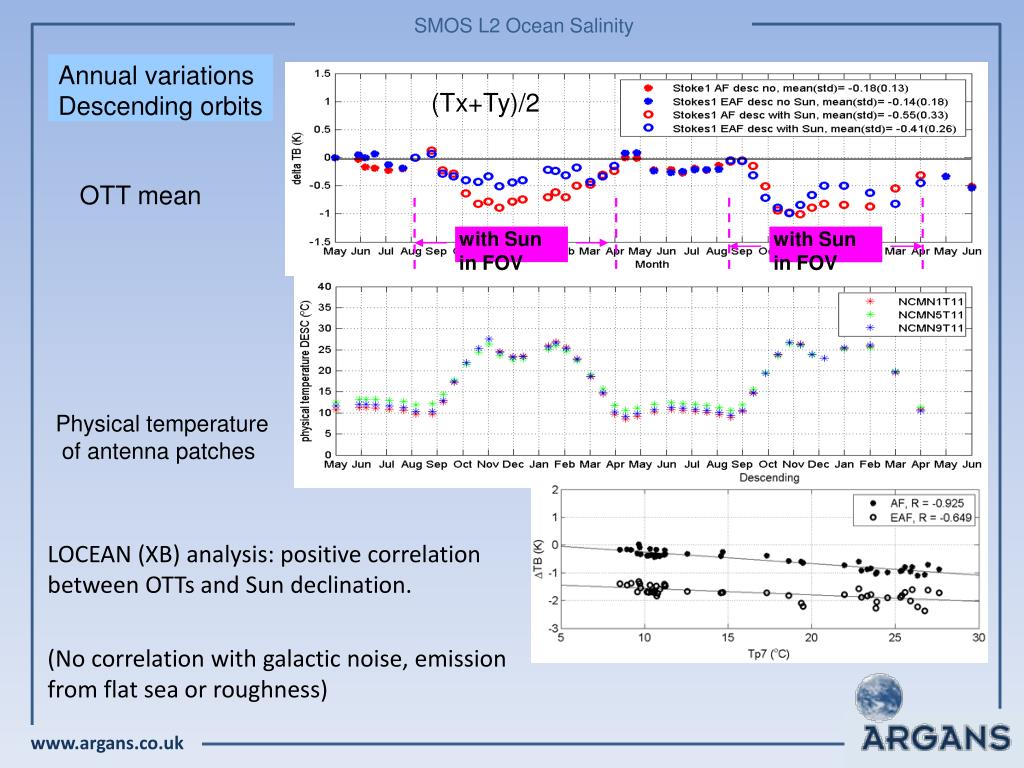 Annual variations Descending orbits (Tx+Ty)/2 OTT mean LOCEAN (XB) analysis: positive correlation between OTTs and Sun declination. (No correlation with galactic noise, emission from flat sea or roughness) with Sun in FOV with Sun in FOV Physical temperature of antenna patches