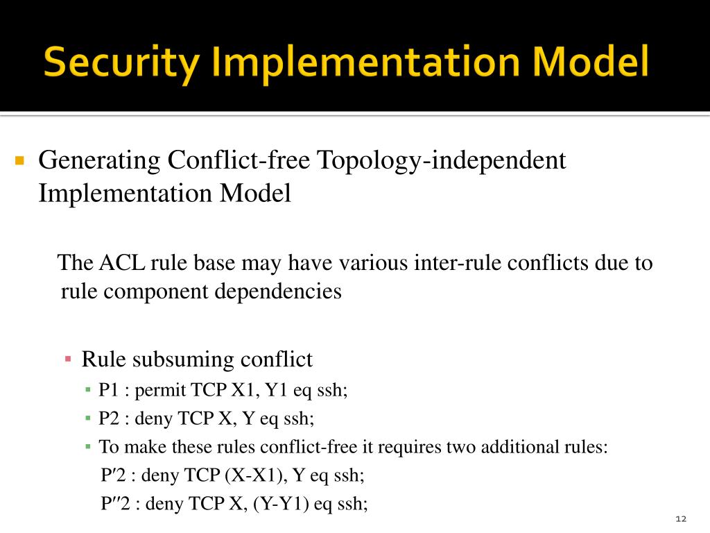 Security Implementation Model • Generating Conflict-free Topology-independent Implementation Model The ACL rule base may have various inter-rule conflicts due to rule component dependencies • Rule subsuming conflict • P1 : permit TCP X1, Y1 eqssh; • P2 : deny TCP X, Y eqssh; • To make these rules conflict-free it requirestwoadditional rules: P′2 : deny TCP (X-X1), Y eqssh; P′′2 : deny TCP X, (Y-Y1) eqssh;