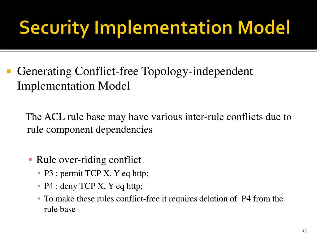 Security Implementation Model • Generating Conflict-free Topology-independent Implementation Model The ACL rule base may have various inter-rule conflicts due to rule component dependencies • Rule over-riding conflict • P3 : permit TCP X, Y eq http; • P4 : deny TCP X, Y eq http; • Tomakethese rules conflict-free it requires deletion of P4 from the rule base