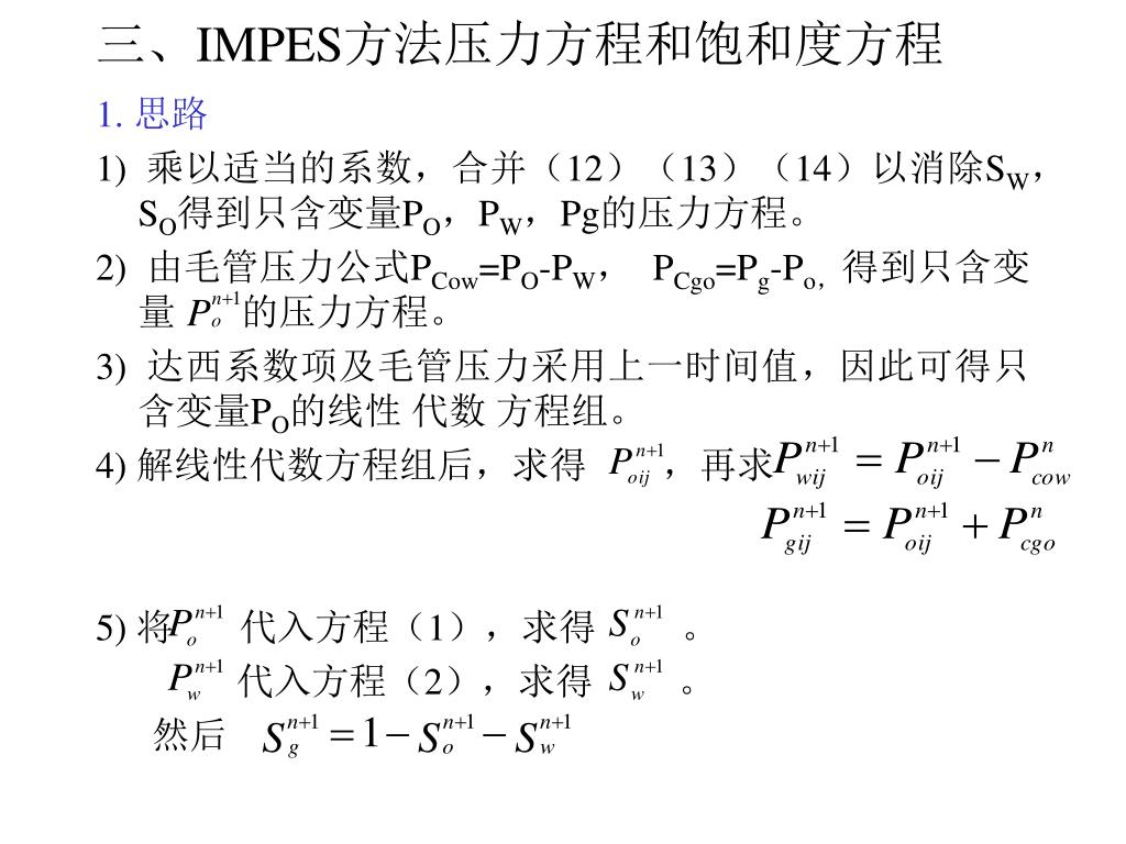 三、IMPES方法压力方程和饱和度方程 • 1. 思路 • 1) 乘以适当的系数,合并(12)(13)(14)以消除SW,SO得到只含变量PO,PW,Pg的压力方程。 • 2) 由毛管压力公式PCow=PO-PW, PCgo=Pg-Po,得到只含变量 的压力方程。 • 3) 达西系数项及毛管压力采用上一时间值,因此可得只含变量PO的线性 代数 方程组。 • 4) 解线性代数方程组后,求得 ,再求 • 5) 将 代入方程(1),求得 。 • 代入方程(2),求得 。 • 然后